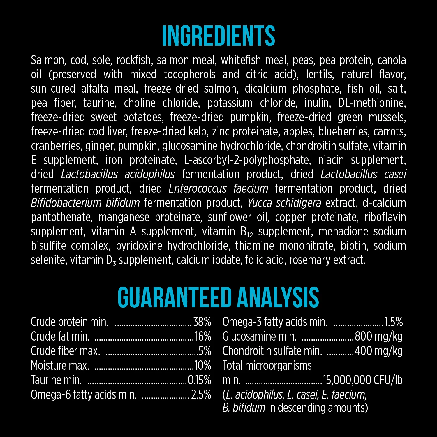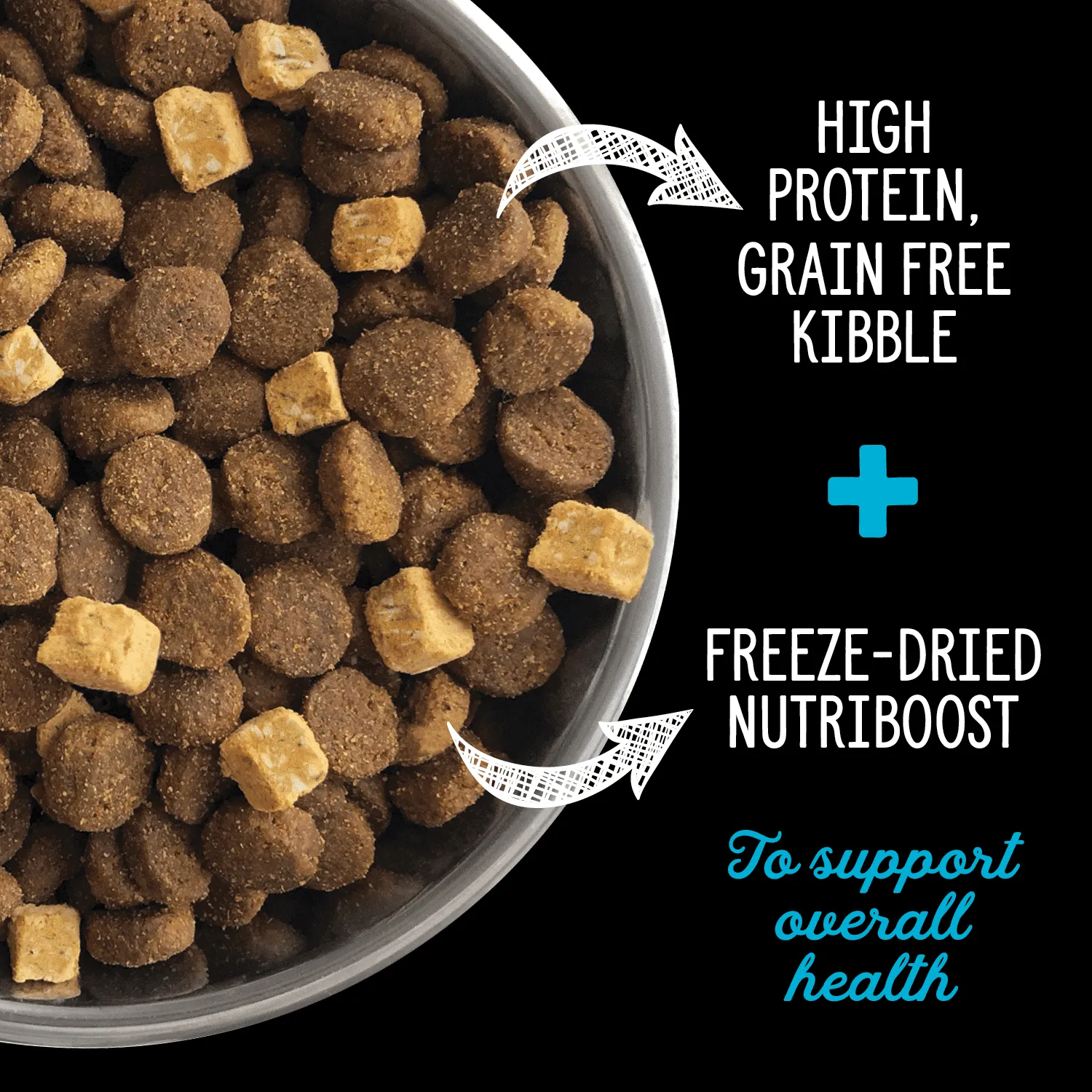 Our high-protein kibble is combined with freeze-dried raw Nutriboost—a minimally processed cube of raw salmon infused with green-lipped mussels to support joints, pumpkin for gut health, cod liver rich in omega-3, and Acadian kelp for immunity support. This unique blend delivers complete and balanced nutrition for dogs of all breeds.