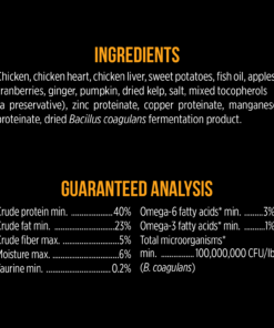 Chicken, chicken heart, chicken liver, sweet potatoes, fish oil, apples, cranberries, ginger, pumpkin, dried kelp, salt, mixed tocopherols (a preservative), zinc proteinate, copper proteinate, manganese proteinate, dried Bacillus coagulans fermentation product.