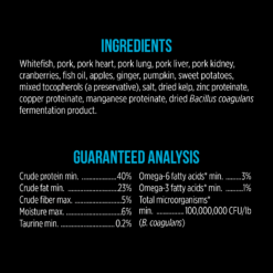 Whitefish, pork, pork heart, pork lung, pork liver, pork kidney, cranberries, fish oil, apples, ginger, pumpkin, sweet potatoes, mixed tocopherols (a preservative), salt, dried kelp, zinc proteinate, copper proteinate, manganese proteinate, dried Bacillus coagulans fermentation product.