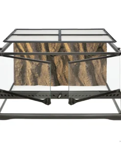 The Exo Terra Glass Terrarium is the ideal reptile or amphibian housing designed by European herpetologists. The front opening doors allow easy access for maintenance and feeding. A specially designed lock will prevent escape and the doors can be opened separately. The full screen top ventilation allows UVB and infrared penetration, and is completely removable for easy access while decorating or cleaning. In the back of the screen cover are 5 closable wire or tube inlets on both sides to install Heat Wave Rocks, Waterfalls, sensors, etc. inside the terrarium. The bottom plate of the terrarium is raised to mount a substrate heater to heat a part of the extended ground surface. The extra high fixed front window is ideal for thick layers of substrates (burrowing reptiles), aquatic parts (paludarium) or to mount an Exo Terra Reptile Den. The natural background has the same color as many other Exo Terra decoration items (Water Dishes, Waterfalls, Heat Wave Rocks, etc.) and provides an extra climbing dimension.