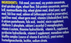 Fish meal, corn meal, soy protein concentrate, dried spirulina algae, wheat flour, fish protein concentrate, oatmeal, krill, montmorillonite clay, wheat gluten meal, dried yeast, squid meal, fish liver meal, salmon oil (ethoxyquin used as preservative), squid liver meal, wheat germ meal, vitamins (cholecalciferol, biotin, d-calcium pantothenate, folic acid, inositol, niacin supplement, riboflavin-5-phosphate, calcium L-ascorbyl-2-monophosphate, vitamin A acetate, thiamine hydrochloride, vitamin B12 supplement, pyridoxine hydrochloride, vitamin E supplement, menadione sodium bisulfite complex (source of vitamin K activity)), yeast extract, fructooligosaccharide, lecithin, sodium citrate; Guarenteed Analysis: Crude protein Min. 43%; Crude fat Min. 5.5%; Omega-3 Fatty Acids Min. 0.6%; Omega-6 Fatty Acids Min. 1.5%; Crude fiber Max. 2.3%; Moisture Max. 9%; Ash Max. 11%; Phosphorus Min. 0.95%; Phosphorus Max. 1.05%; Magnesium Min. 0.2%; Iron Min. 250 ppm; Beta-Carotene Min. 3,200 IU/lb; Vitamin A 7,000 IU/lb; Ascorbic Acid (Vitamin C) Min. 350 mg/lb; Vitamin E Min. 50 IU/lb
