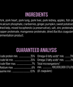 r: #413e3c;”>Pork, pork heart, pork lung, pork liver, pork kidney, apples, fish oil, tricalcium phosphate, cranberries, ginger, pumpkin, sweet potatoes, dried kelp, mixed tocopherols (a preservative), salt, zinc proteinate, copper proteinate, manganese proteinate, dried Bacillus coagulans fermentation product.
