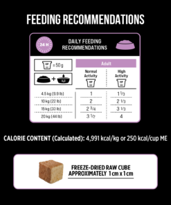 Calorie Content (calculated): 4,991 kcal/kg or 250 kcal/cup ME